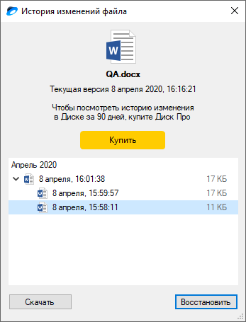 Яндекс Диск файлдарды өзгерту тарихын сақтап қояды. Егер сіз, мысалы, файлдан байқамастан маңызды ақпаратты өшіріп тастасаңыз, оның алдыңғы нұсқасына оралып, ақпаратты қалпына келтіре аласыз.
