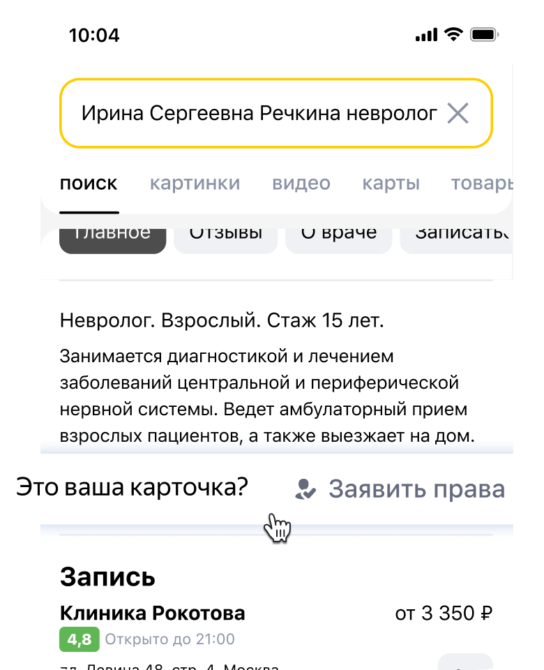 Карточка врача в поиске — это блок с информацией о специалисте в поиске Яндекса. Карточка появится, когда робот Яндекса проиндексирует сайт клиники или организация самостоятельно передаст данные о сотрудниках по инструкции. Это бесплатно.