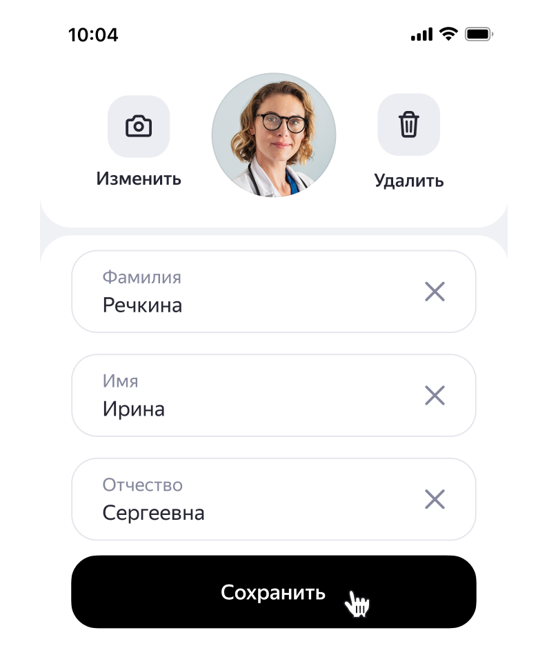 Чтобы изменить фото, информацию о специализации или городе приема, рядом с вашим именем нажмите . Внесите изменения и нажмите Сохранить.