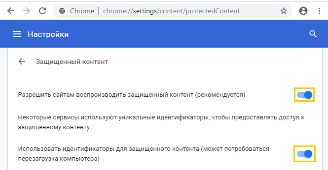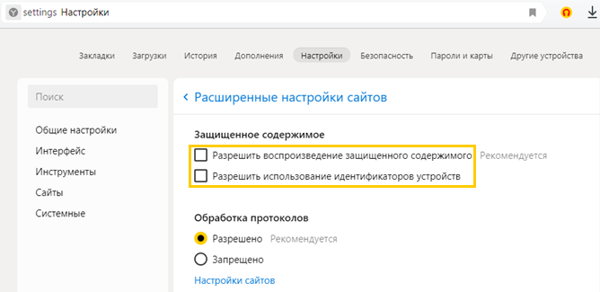 - Сайттарға қорғалған мазмұнды ойнатуға және қорғалған мазмұн үшін идентификаторларды пайдалануға рұқсат беру опцияларын қосыңыз.