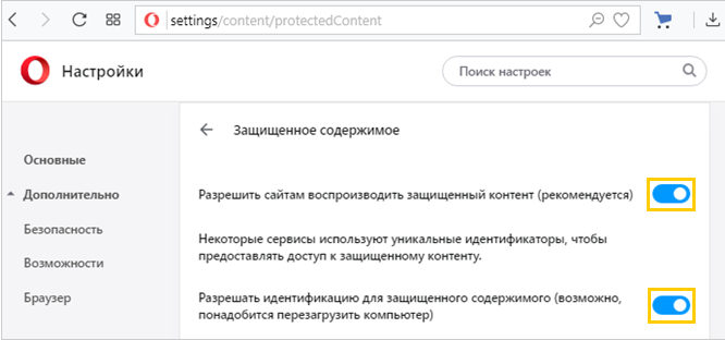- Сайттарға қорғалған мазмұнды ойнатуға және қорғалған мазмұн үшін сәйкестендіруді пайдалануға рұқсат беру опцияларын қосыңыз.