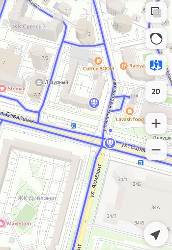 Карты қызметінде панорамалары бар көшелер картада түспен ерекшеленген.