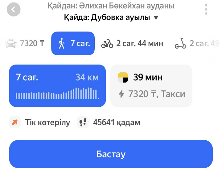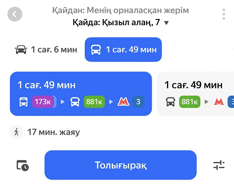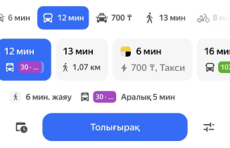Яндекс Карталар маршруттарды құрған кезде, көліктің түрлі типтерін ескереді. Барлық нұсқаны қарау және уақытын салыстыру үшін маршрут құрыңыз және батырмасын басыңыз.
