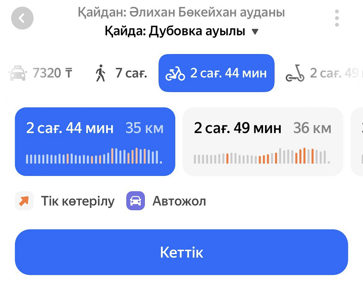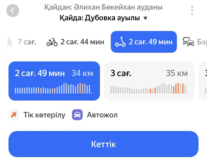 Маршрут бойынша жүруді бастау үшін Кеттік батырмасын басыңыз, жолда кететін уақыт сол уақыттағы жағдаймен қайта есептеледі.