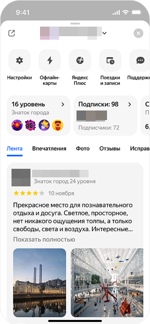 Некоторые функции приложения можно использовать, если войти в личный кабинет, например оставлять отзывы об организации и прикреплять фотографии к объекту.