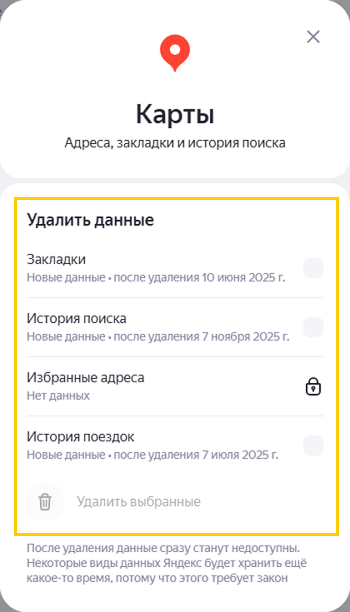 Данные будут удалены только из личного кабинета Карт. При необходимости удалите их отдельно из других сервисов.