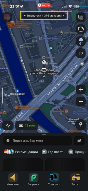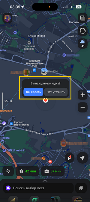 Если есть проблемы с сигналом GPS, при открытии приложения на главном экране отобразится плашка Вы находитесь здесь? с предложением уточнить ваше местоположение. Если вы начнете взаимодействовать с картой, плашка исчезнет, а вверху экрана появится кнопка Уточнить геолокацию.