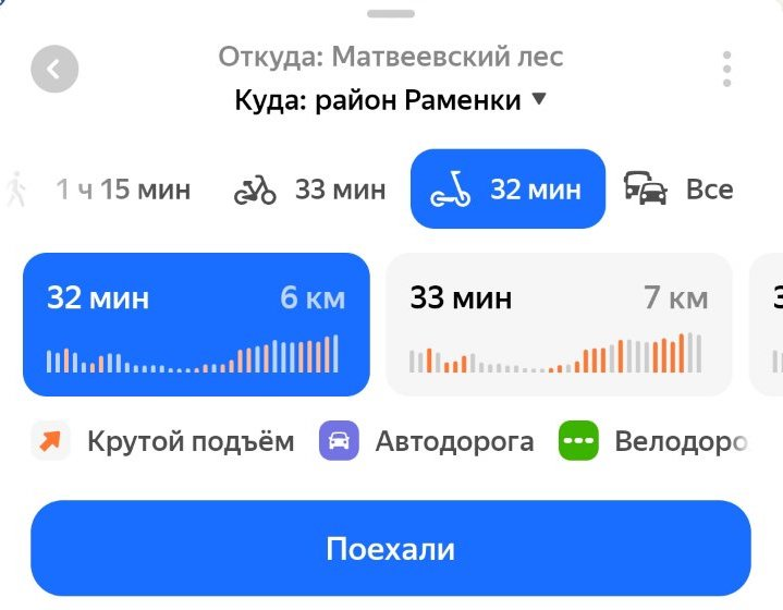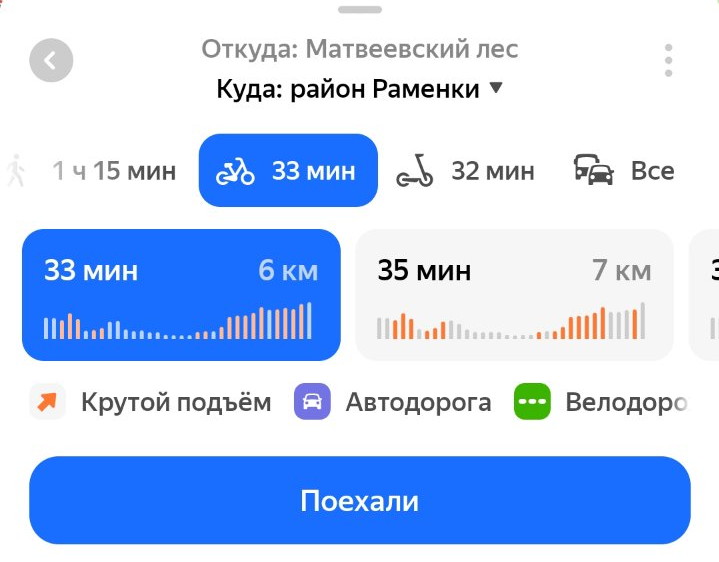 При построении маршрутов на велосипеде или самокате можно выбрать наиболее легкий путь: