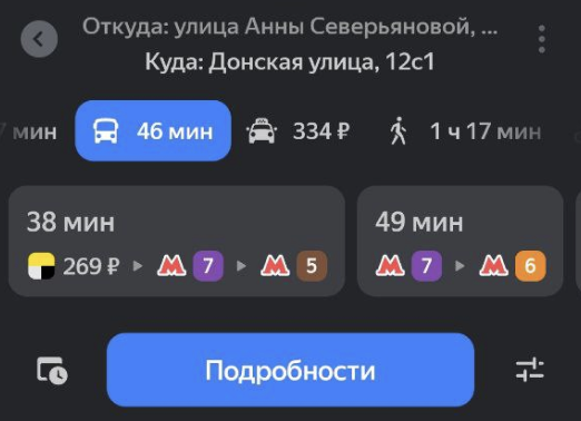 Яндекс Карты строят маршруты с учетом разных типов транспорта. Чтобы посмотреть все варианты и сравнить время, постройте маршрут и нажмите .