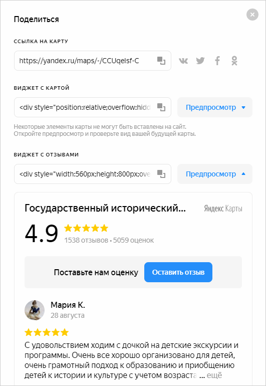 Чтобы использовать на своем сайте карту, найденный объект или построенный маршрут, скопируйте код из поля Виджет с отзывами
