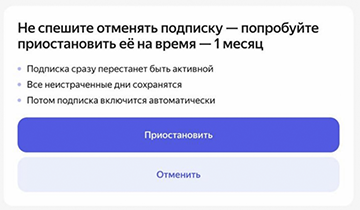Сіз жазылымды кез-келген уақытта жеке кабинетіңізде жалғастыра аласыз. Егер бұны жасамасаңыз, жазылым өздігінен автоматты түрде қосылады. Тоқтата тұру кезеңі өткенде-ақша қайтадан есептен шығарыла бастайды.