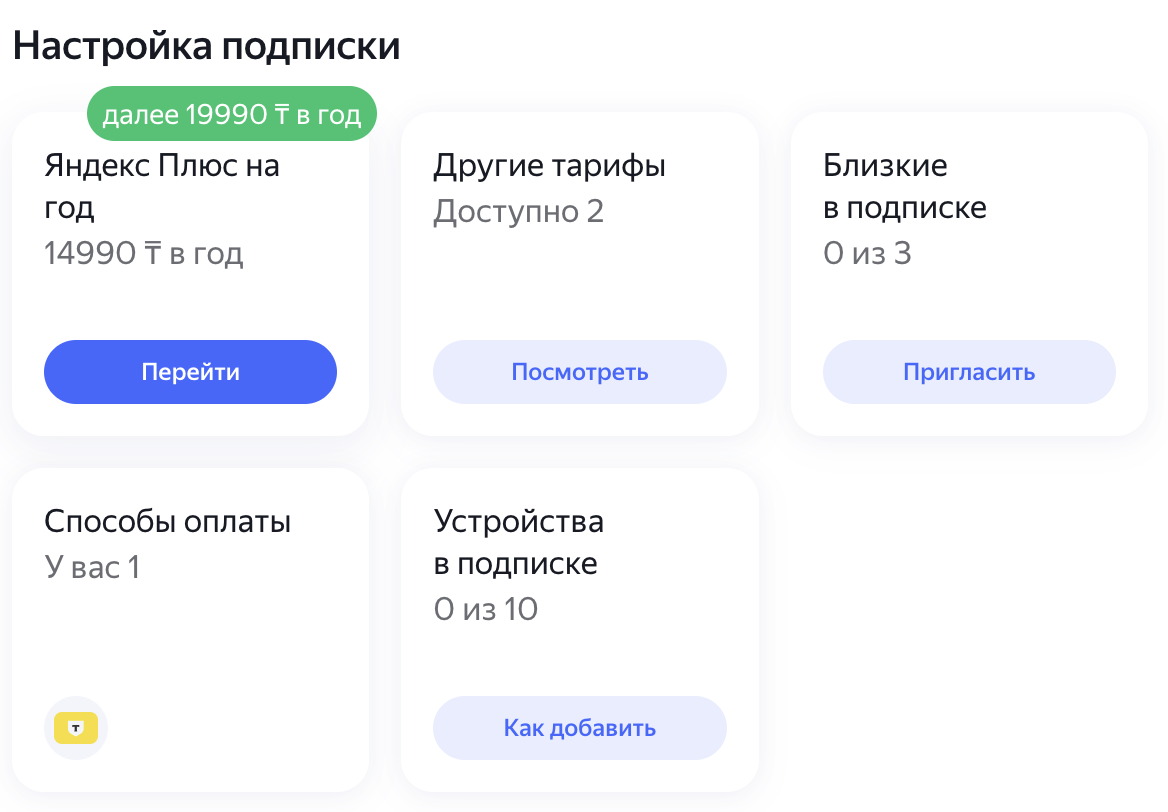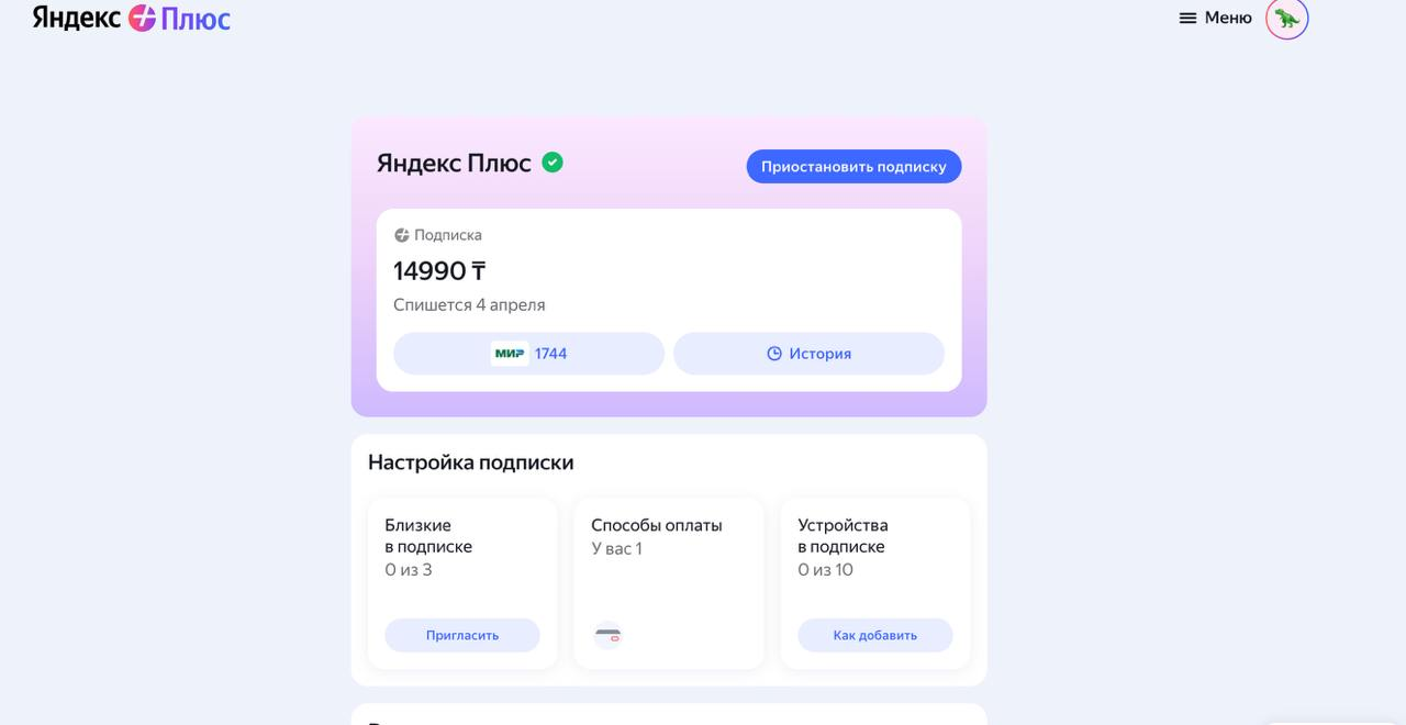 Яндекс Плюс — это Кинопоиск, Яндекс Музыка, Яндекс Книги, эфиры Setanta и кешбэк баллами для вас и трёх ваших близких. Стоит такая подписка 1 999 ₸ в месяц.