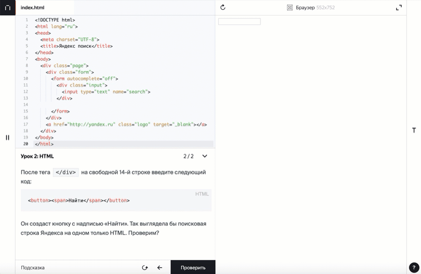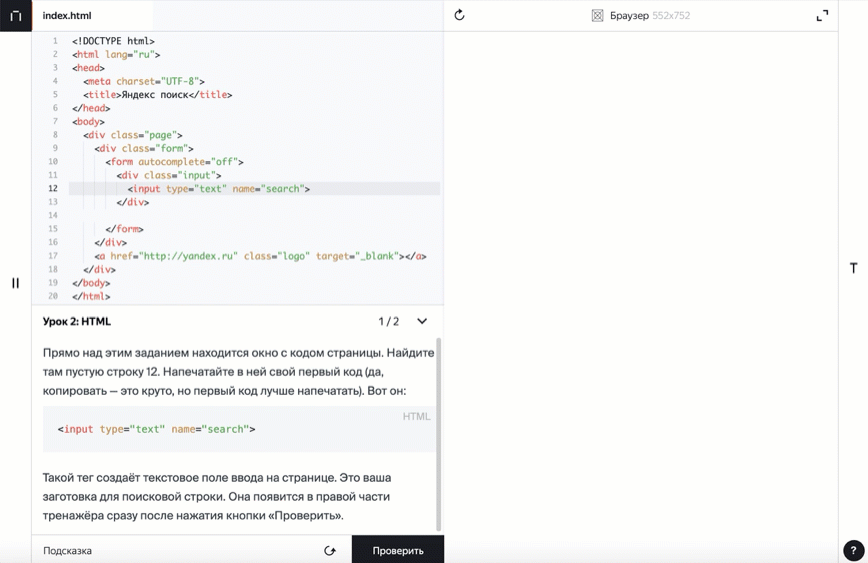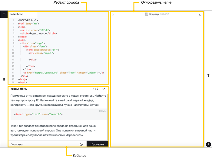 Онлайн-тренажер — специальная среда, в которой вы пишете программы или выполняете другие задания и видите результаты их выполнения. Благодаря ему вам не нужно устанавливать на свой компьютер дополнительное программное обеспечение.