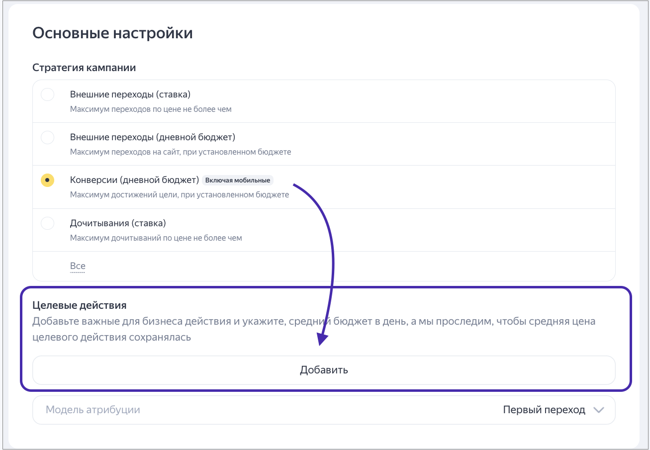 Выберите в блоке Стратегия кампании → Конверсии (дневной бюджет).