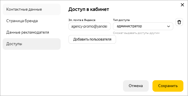 Введите электронную почту, которая привязана к главному логину агентства и в выпадающем списке выберите тип доступа администратор.