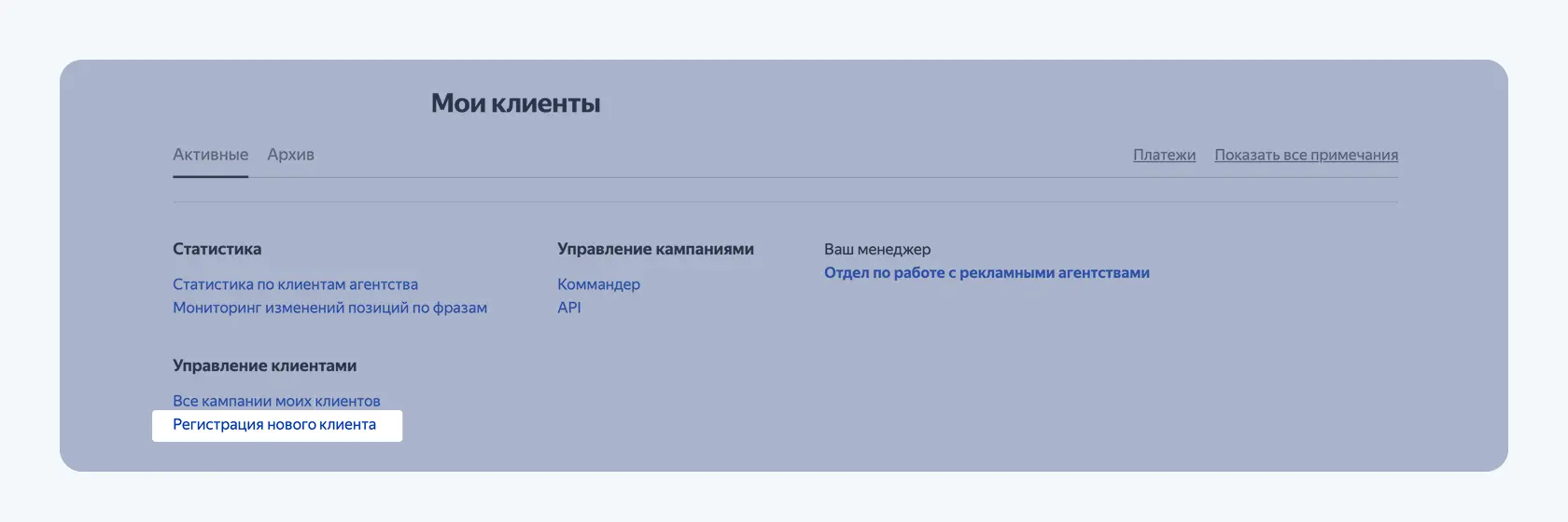 Регистрация. Представителю агентства нужно перейти в Директе на страницу Мои клиенты → Регистрация нового клиента.