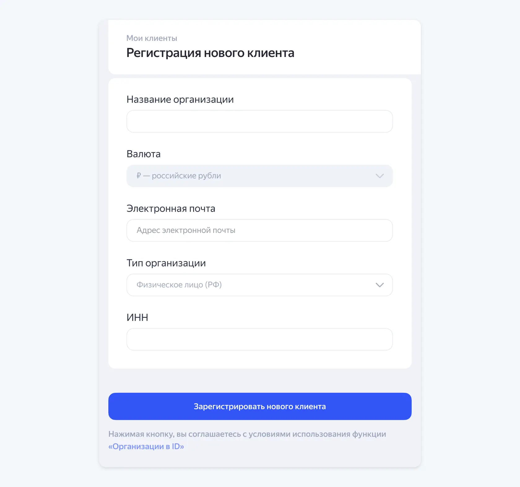 Название организации на русском или английском языке. Название должно быть в понятном вам формате, так как далее именно оно будет отображаться в списке на странице Мои клиенты.