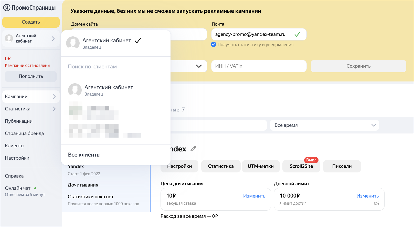 Войдите в кабинет ПромоСтраниц под главным логином агентства.