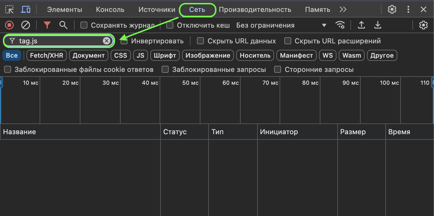 Перейдите на вкладку Сеть и введите в фильтр tag.js.