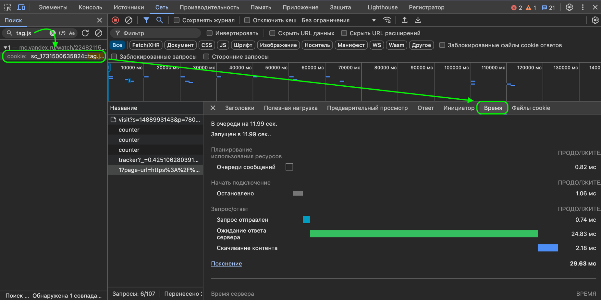Очистите журнал → Обновите страницу → Нажмите на первый tag.js → Откройте вкладку Время и посмотрите, когда скрипт начал загрузку.