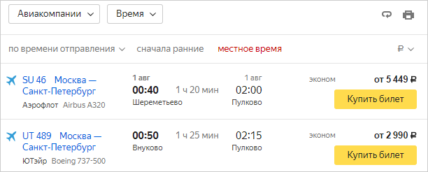 На Яндекс Расписаниях можно посмотреть расписание рейсов популярных авиалиний.