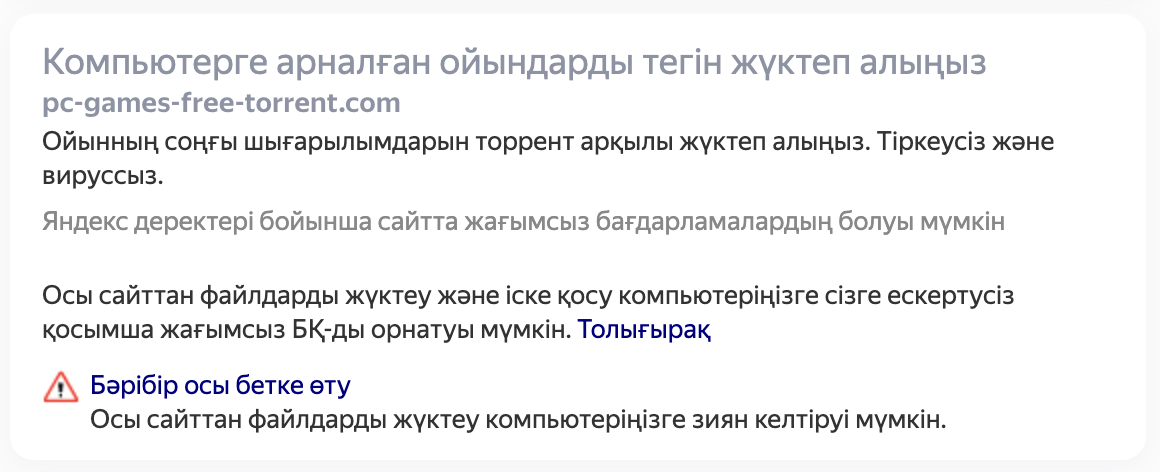 Пайдаланушыларды қорғау үшін Яндекс индекстелген сайттарда қауіпті кодтың бар-жоғын үнемі тексеріп отырады. Егер мұндай код табылса, қауіпті ресурстың сниппетінде келесі ескерту жазылады: «Сайт компьютер немесе мобильді құрылғыңыздың қауіпсіздігіне қауіп төндіруі мүмкін».