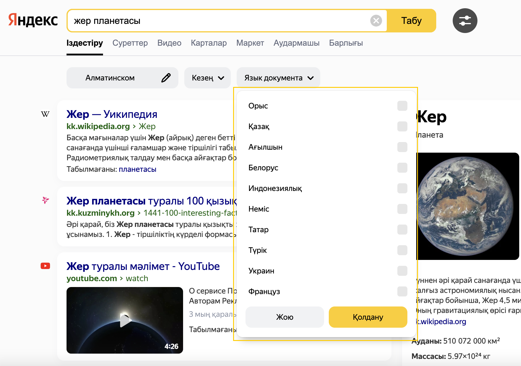 Кеңейтілген іздеу сүзгілерінің көмегімен сіз белгілі бір тілдегі сайттар мен құжаттарды іздей аласыз.