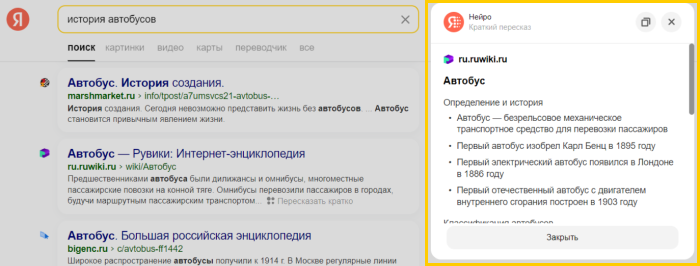 С помощью функции краткого пересказа вы можете просмотреть основное содержание текста, не открывая саму страницу. Это позволит сразу определить, есть ли на странице что-то полезное для вас, и сократит время поиска. По данным Яндекс, прочтение большой статьи обычно занимает около 15 минут, тогда как краткий пересказ можно прочитать менее чем за минуту.