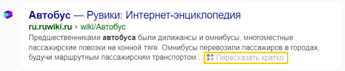 Чтобы открыть краткий пересказ текста, нажмите Пересказать кратко в сниппете.