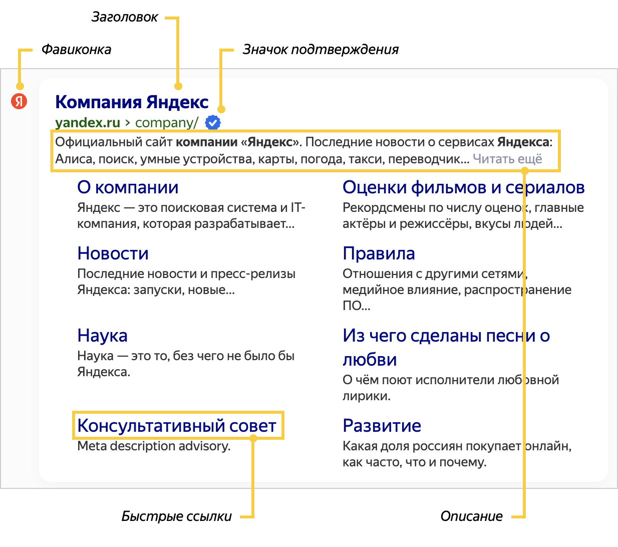 Благодаря сниппету пользователь получает представление о странице или нужную информацию, не заходя на сайт. В сниппете могут отображаться: