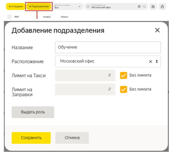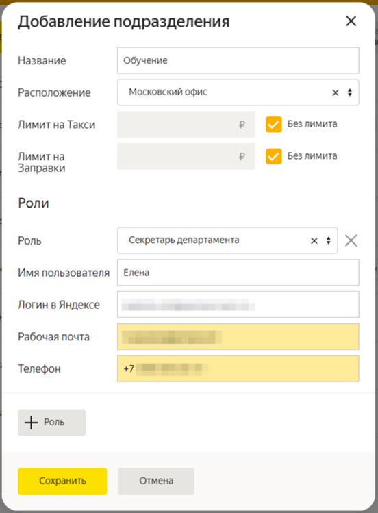 Подразделения должны быть созданы перед добавлением роли. К каждой роли нужно привязать логин на Яндексе.