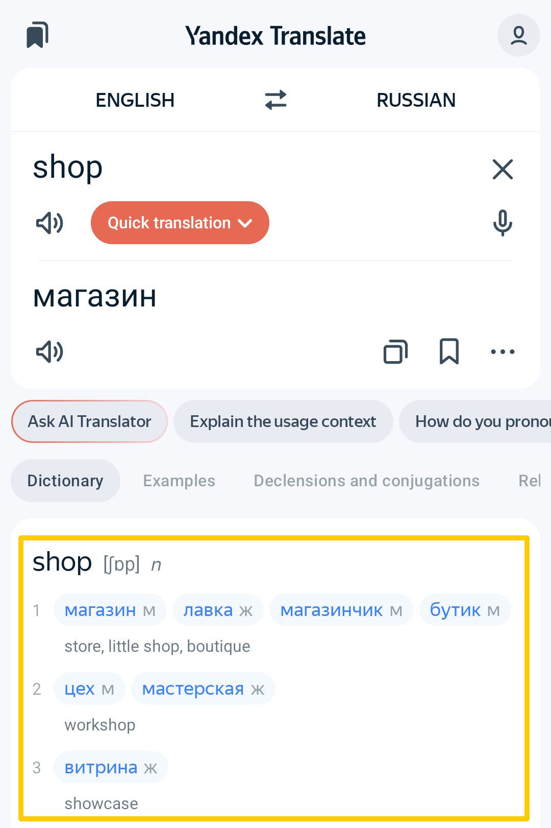 In addition to text translations, Yandex Translate provides detailed dictionary entries with phonetic transcriptions, translations of individual words, and usage examples.