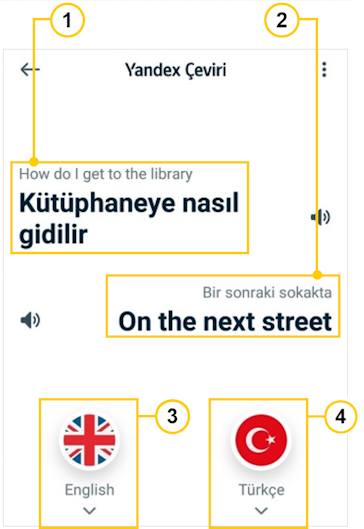 1 — Sizin sözleriniz, 2 — Muhatabınızın yanıtı, 3 — Seçtiğiniz dil, 4 — Muhatabınızın seçtiği dil. |