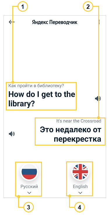 Tanlangan tildagi jumlalar mayda, suhbatdoshingiz tilidagi jumlalar esa — katta shriftda chiqadi. Tillar joyini almashtirish uchun tillarni tanlash ekranida