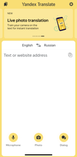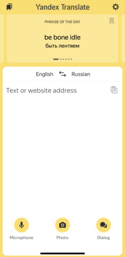 If the language of your device is Russian or English, the phrase of the day in the target language and a description of the app's new features are displayed on the Yandex Translate home screen. The phrases are updated daily.