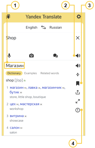 4 — Report an error in the translation. Parts of the translation or dictionary entry will be highlighted in yellow. Tap the part where you noticed the error. In the window that opens, describe the error and tap Send.