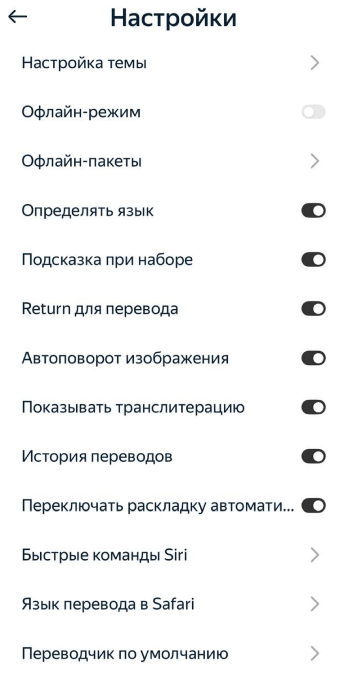 Настройка темы — выбрать тему оформления и акцентный цвет Офлайн-режим — переводить текста без интернета Скачать офлайн-перевод — загрузить словари с нужными языками для офлайн-режима Определять язык — автоматически определять, на каком языке написан исходный текст Подсказка при наборе — добавить панель с подсказками Return для перевода — использовать клавишу переноса строки, чтобы подтвердить ввод Автоповорот изображения — поворачивать изображение при фотопереводе, если оно снято в другой ориентации Показывать транслитерацию — включить транслитерацию. Доступно не для всех языков История переводов — сохранять историю переводов на устройстве Переключать раскладку автоматически — переключать раскладку на клавиатуре при смене языков в приложении. Может не работать со сторонними клавиатурами Быстрые команды Siri — готовые шаблоны для приложения Команды Язык перевода в Safari — выбрать язык, на который будут переводиться страницы в Safari Обратная связь — связаться со службой поддержки Справка — открыть Справку по приложению О приложении — узнать номер версии приложения Оценить в App Store — оставить оценку и комментарий в магазине приложений Войти — авторизоваться с Яндекс ID для синхронизации подборок. Подробнее об аккаунте на Яндексе см. в разделах Регистрация аккаунта и Восстановление доступа Справки Яндекс ID |