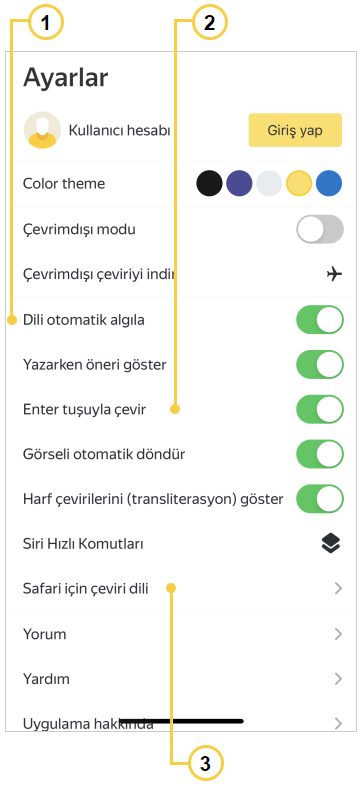 1 — çevrimdışı çeviri için dil paketi indir, 2 — veri girişini onaylamak için satır sonu tuşunu kullan, 3 — Safari eklentisiyle web sitesi çevirmek için dil seç. |