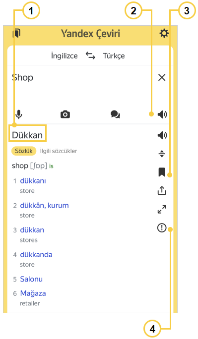 Yandex Çeviri, tek tek kelimeler ve ifadelerin yanı sıra web sitelerinde ve mobil uygulamalardaki metinleri de çevirir.