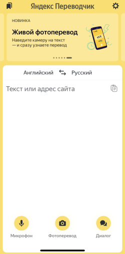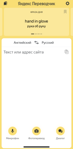 Agar interfeys uchun rus yoki ingliz tilini oʻrnatgan boʻlsangiz, tarjimonning bosh ekranida tarjima tilidagi kun iborasi va ilovaning yangi xususiyatlariga oid tavsif chiqadi. So‘zlar to‘plami har kun yangilanadi.