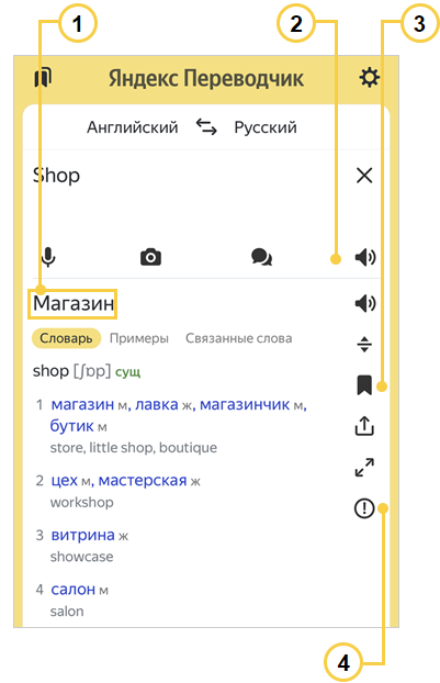 4 — Tarjimadagi xato haqida xabar berish. Tarjima yoki lugʻat maqolasining bir qismi sariq rang bilan belgilanadi, xatolik aniqlangan qism ustiga bosing. Paydo boʻlgan oynada xato mazmunini tavsiflang va Yuborish tugmasini bosing.