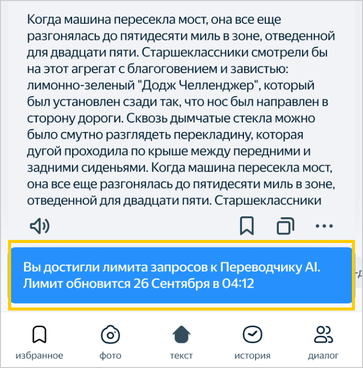 Modelda tarjima soʻrovlari soni cheklangan. Agar limit tugasa, ruxsat tiklangan sana va vaqt koʻrsatilgan bildirishnoma ekranning pastki qismida chiqadi.