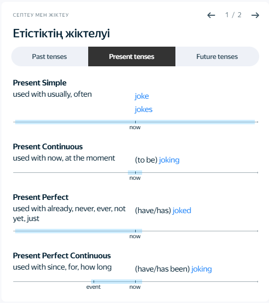 Байланыстырылған сөздердің астында кейбір тілдерге арналған Септеулер мен жіктеулер блогы бар. Зат есімдер жекеше және көпше түрдегі формалар, ал етістіктер үшін өткен, осы, келер шақ формалары келтірілген.