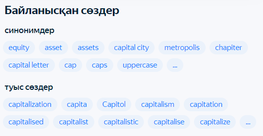 Сөздік мақаланың астында синонимдер, антонимдер мен туыс сөздер көрсетілген. Осы сөздердің біреуінің аудармасын көру үшін қажетті сөзді басыңыз.