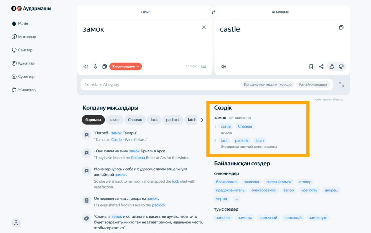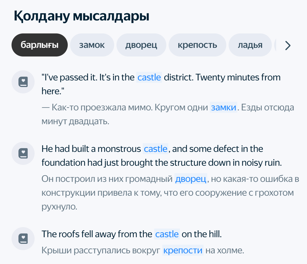 Сөздік мақаланың сол жағында сіз сөздердің қолданылу үлгілерін — идиомаларды, кітаптар мен фильмдерден алынған дәйексөздерді қарай аласыз.
