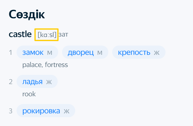 Транскрипция кейбір тілдер мен сөздер үшін қолжетімді. Мысалы, ағылшын тіліндегі сөздердің транскрипциясы тек ағылшын тілінен орыс тіліне аударылған кезде көрсетіледі. Кері аударма кезінде транскрипцияны көру үшін, аударманың астындағы сөздік мақаладағы сөзге сілтемені басыңыз.