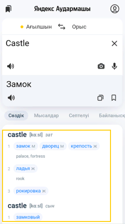 Сөздік мақалалар аударма мәтінінің астында көрсетіледі. Сонымен қатар, қызмет іріктеп алады: