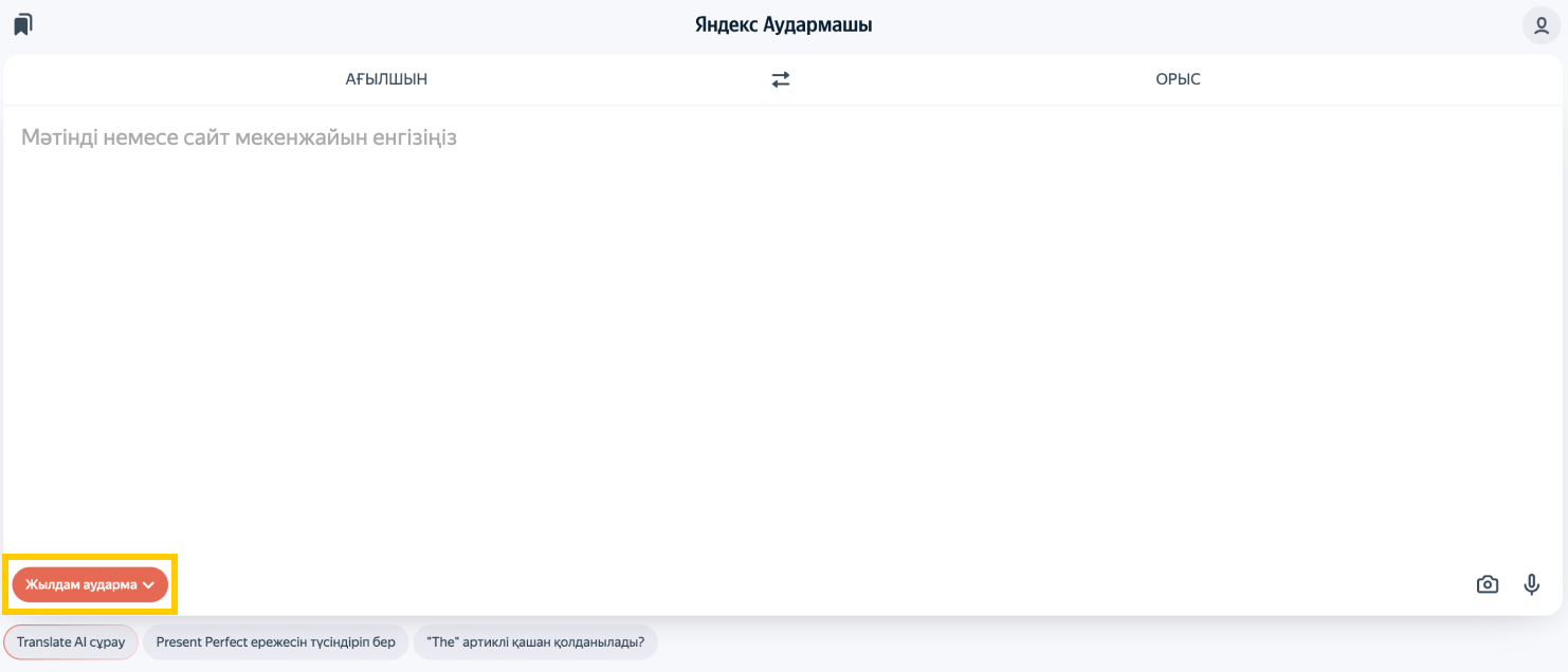 Мәтінді аудару үшін енгізу өрісіне сөзді немесе тіркесті енгізіңіз. Мәтінді бірнеше жолмен енгізуге болады: