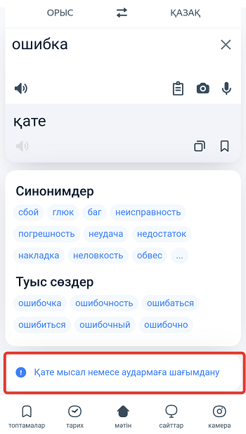 Егер сіз аудармада немесе сөздікте қандай да бір қатеге тап болсаңыз, оған тікелей сайттан шағымдана аласыз. Ол үшін экранның төменгі жағындағы Қате мысал немесе аудармаға шағымдану жазуын басыңыз, қажетті элементті таңдаңыз және Хабарлау батырмасын басыңыз. Сондай-ақ, сіз түсініктеме қалдыра аласыз.