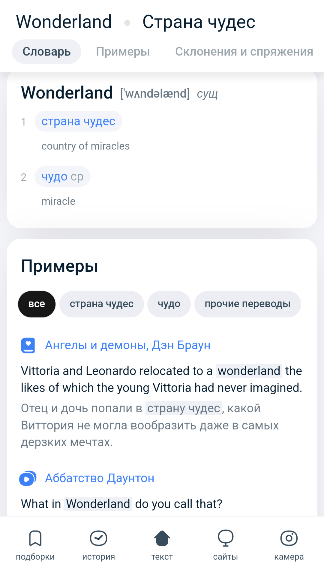 Также вы можете воспользоваться отдельной вкладкой с примерами. Это позволит вам не отвлекаться на другие элементы словаря и сосредоточиться только на примерах использования.